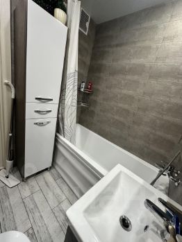 Санузел с современным ремонтом: новая система водоснабжения, новые счётчики, выводы под водонагреватель, стиральная машина в отличном состоянии.