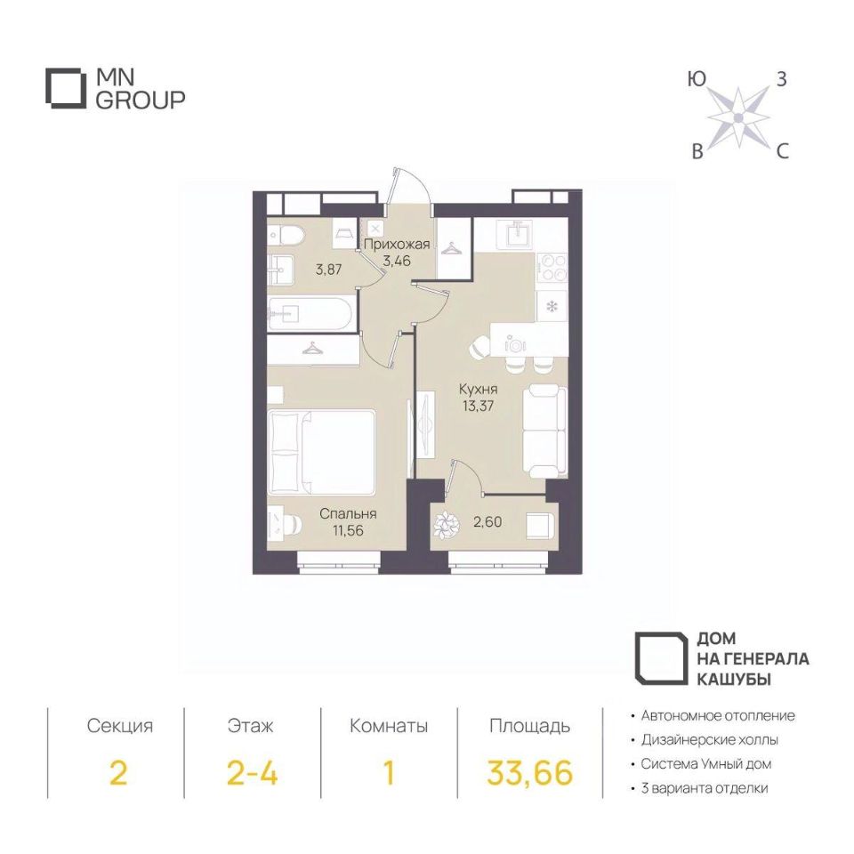 Продается 1-комн. квартира комфорт-класса на 3 этаже в клубном доме на Генерала Кашубы