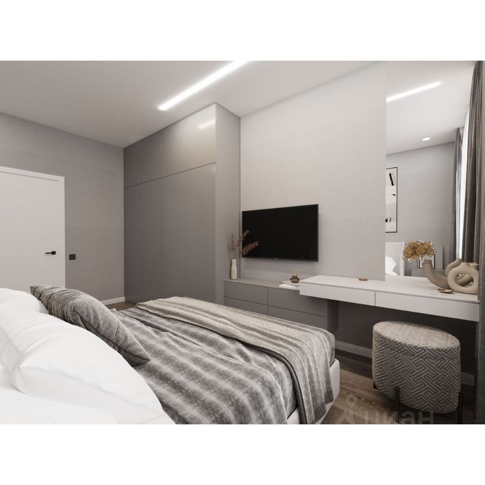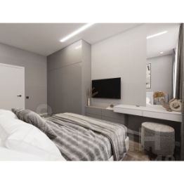 Санузел оформлен коллекционным крупноформатным керамогранитом, матовая и акцентная плитка подчеркивает индивидуальность вашего интерьера. В ванной устанавливается современная сантехника: акриловая ванна с экраном, выложенным плиткой, тропический душ с режимом аквамассажа, подвесная тумба со встроенной раковиной и электрический полотенцесушитель. Эргономичное зеркало-шкаф обеспечивает компактное хранение без визуального шума. Инсталляция, размещенная над полом, скрывает все лишнее и добавляет легкости интерьеру.