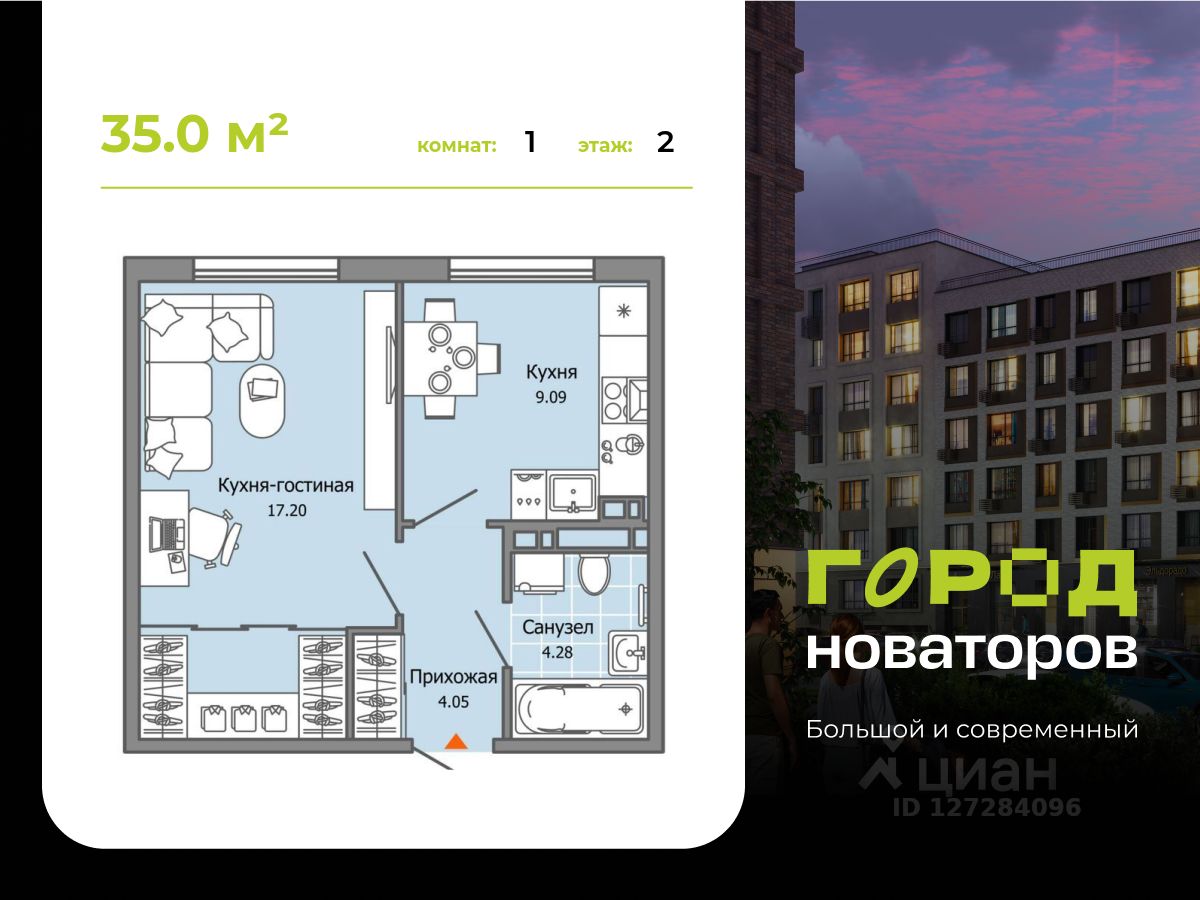 В продаже 1-комнатная квартира площадью 35.00 кв. м в жилом комплексе "Город новаторов" в Ульяновске.