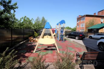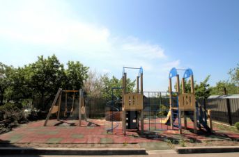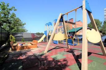 Собственная детская площадка с качелями, горкой, песочницей и лавочкой.