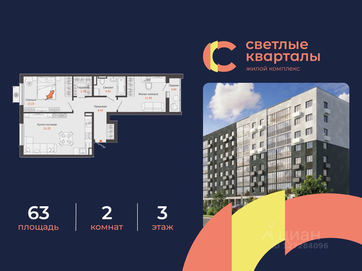 В Заволжском районе Ульяновска, рядом с Прибрежным парком, продается 2-комнатная квартира площадью 63.00 кв. м. Квартира находится на 3 этаже дома 4 комплекса комфорт-класса "Светлые кварталы" (Застройщик - ГК "Железно").