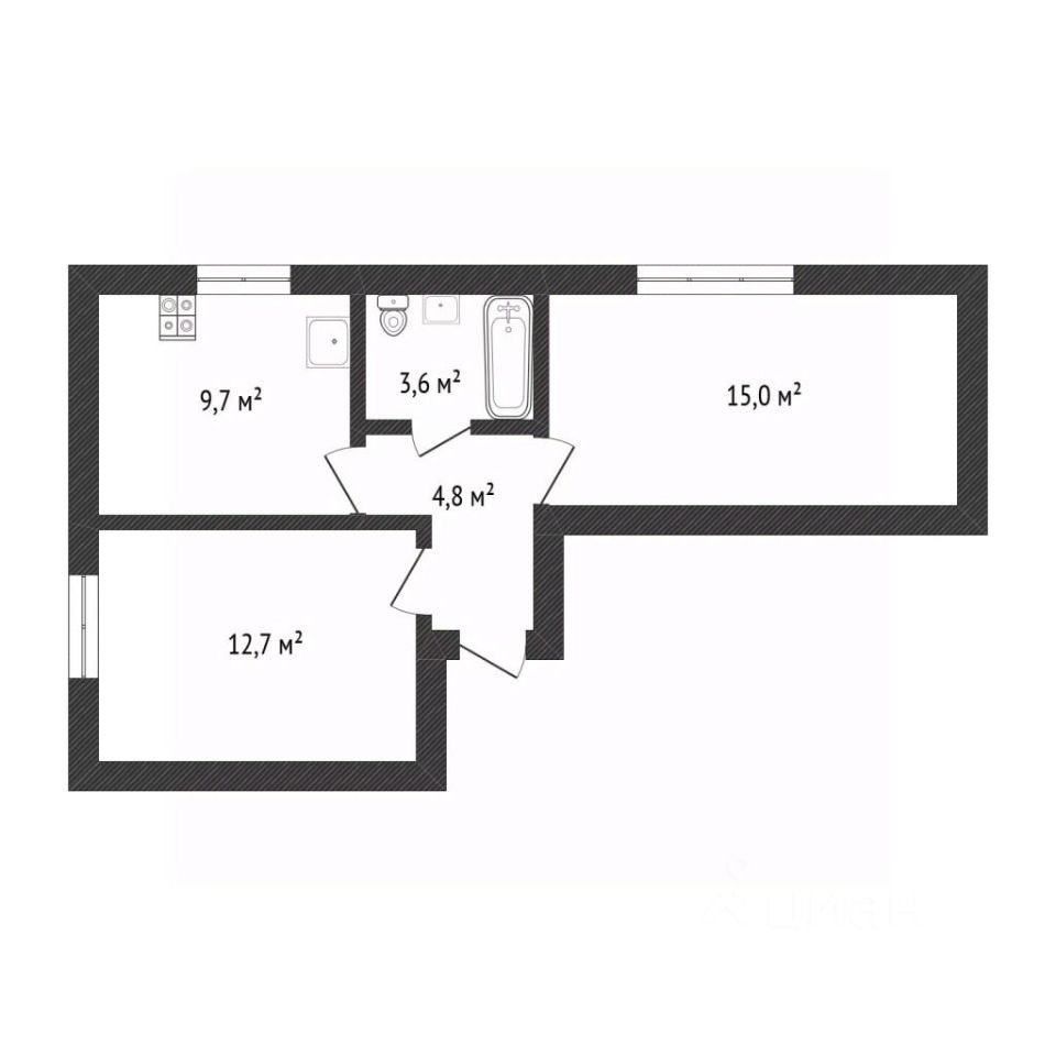 Комнаты: изолированные, 15 кв. м (зал) и 12,7 кв. м (спальня). В зале остается раскладной диван.