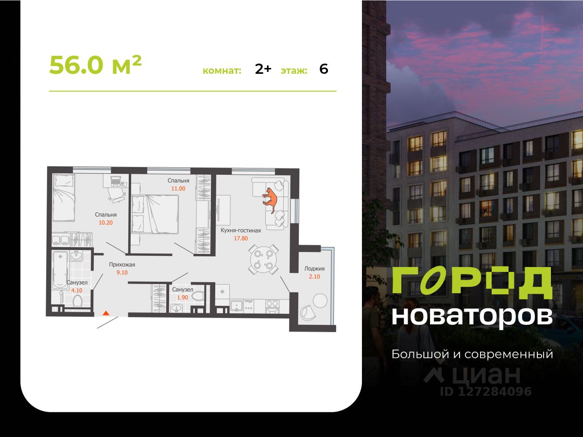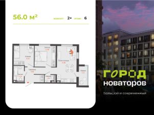 В продаже 2-комнатная квартира площадью 56.00 кв. м в жилом комплексе "Город новаторов" в Ульяновске.