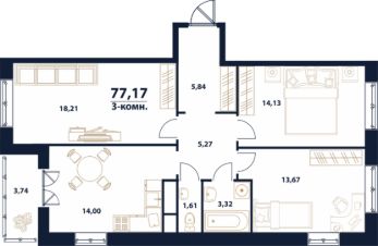 Продаётся 3-комнатная квартира в строящемся доме (дом 5), срок сдачи: I-кв. 2026, общей площадью 77.17 кв.м., на 2 этаже.