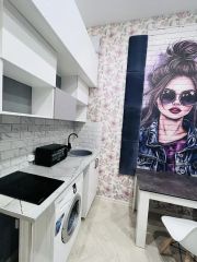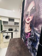 Внизу ,Кухонная зона оборудована всем необходимым: холодильник, встроенная варочная панель, мини печь, стиральная машина и современная мебель.