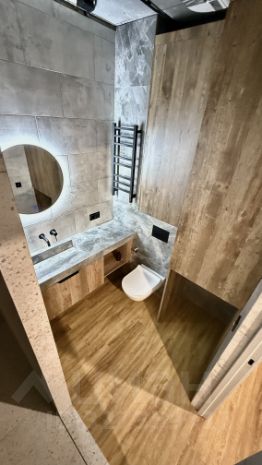 • на полах арт винил в цвет натурального дерева, который не боится, воды, ударов, сколов, для этого наливались полы в один уровень.