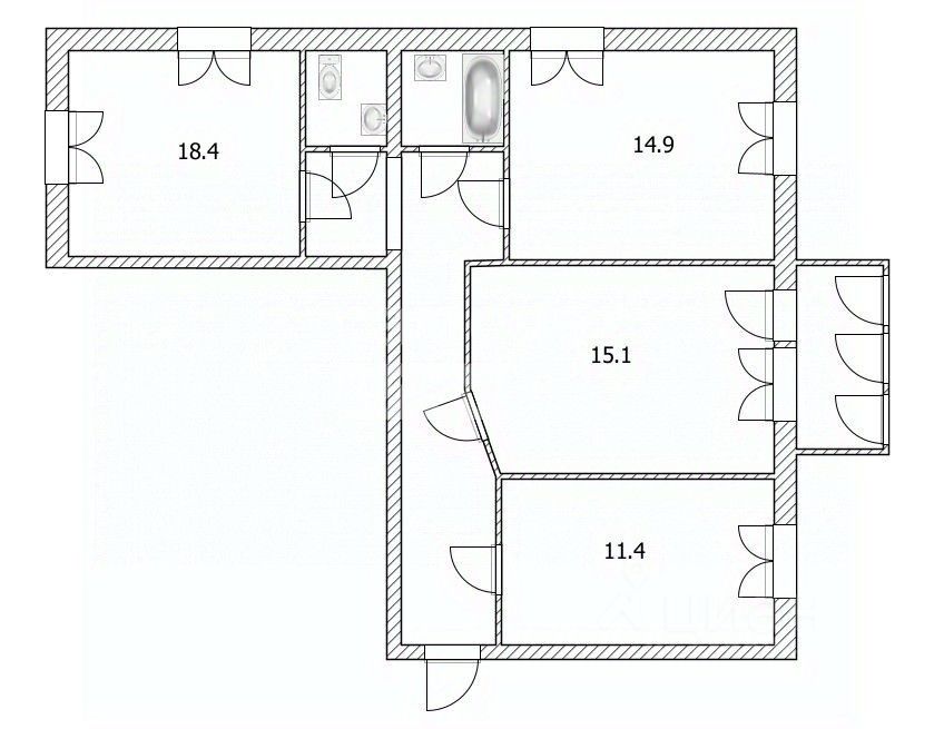 Большие комнаты (18 кв. м и 15 кв. м+ 15 кв м) свободно разместите мебель и останется много места.