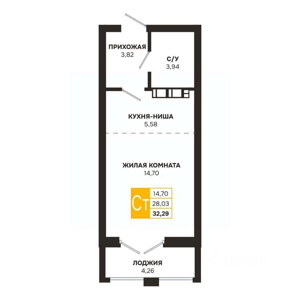 Студия, 32,29 м²