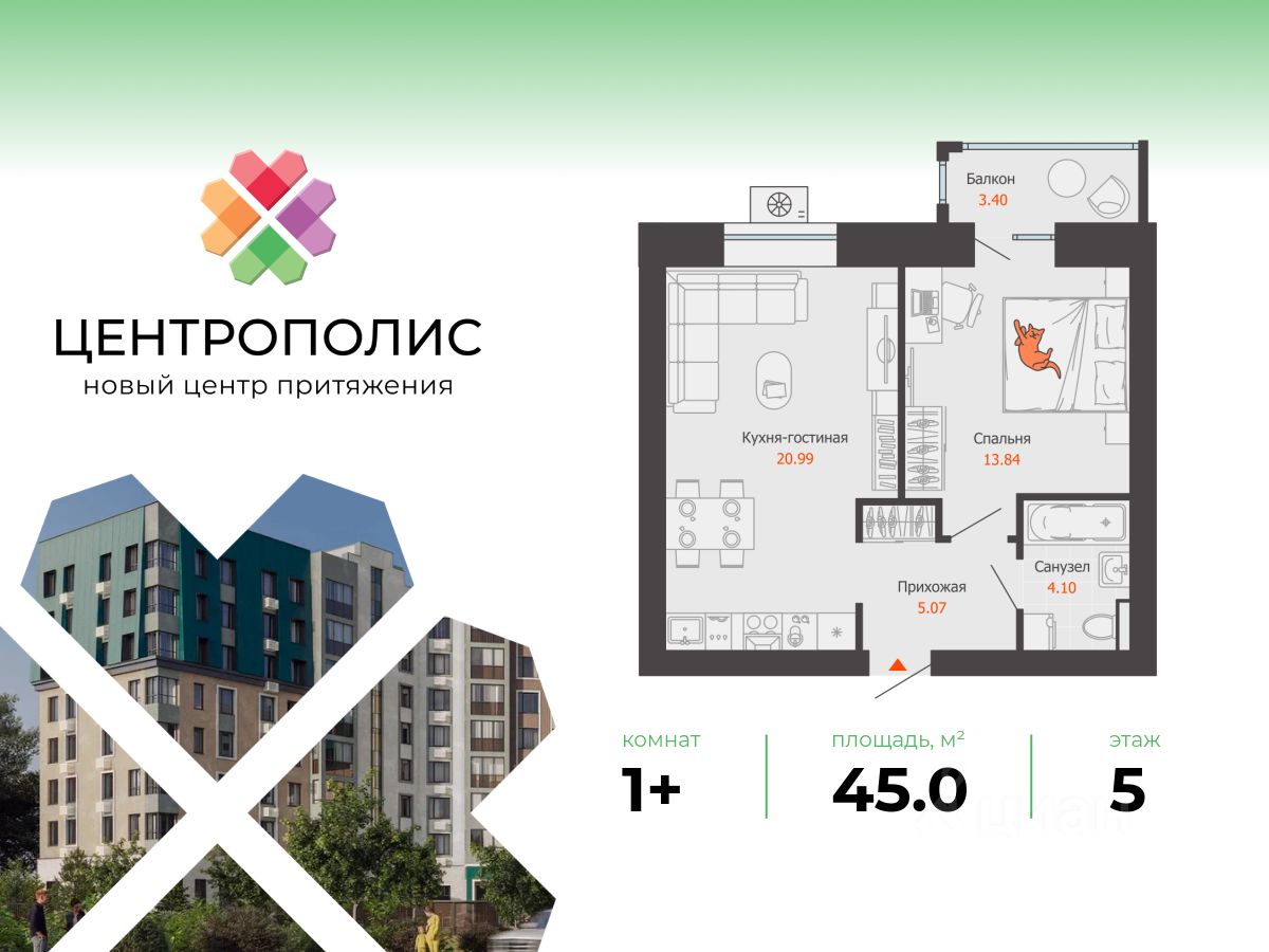 В центральном квартале Ульяновска продается 1-комнатная квартира площадью 45.00 кв. м. Квартира расположена на 5 этаже дома 6 в жилом комплексе комфорт-класса Центрополис.