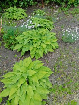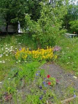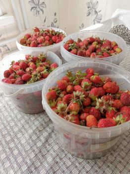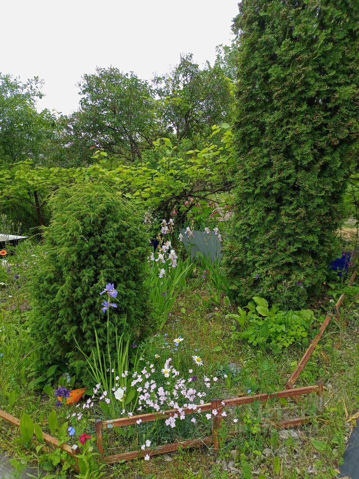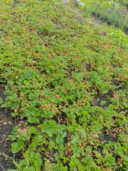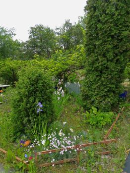 Есть плодоносящие насаждения: 5 яблонь, груша, 3 сливы (желтая, розово-фиолетовая), малина, смородина,плантация клубники, виноград.