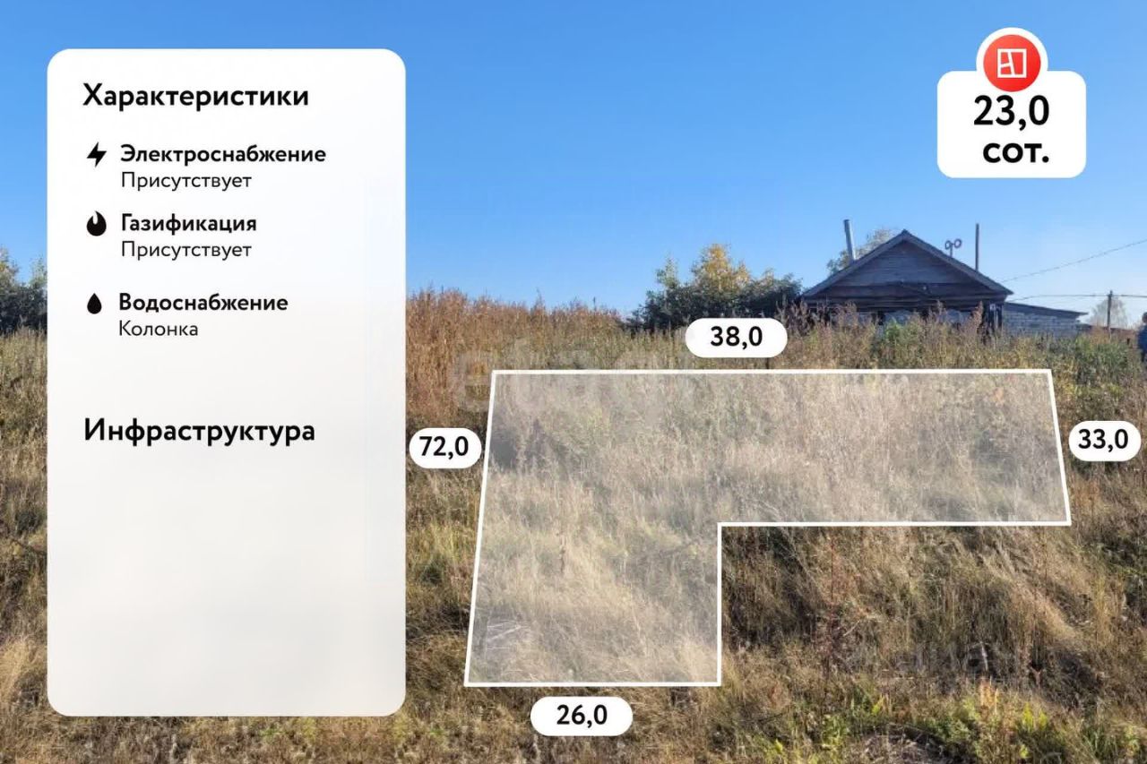 Повседневные потребности обеспечены наличием школы, детского сада, медпункта, магазинов и учреждений культуры. Участок подготовлен для строительства: территория огорожена, подведены магистральные газ, электричество и водопровод.