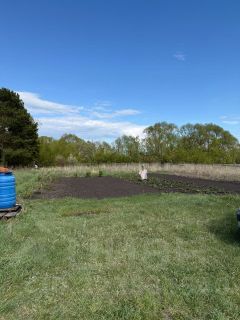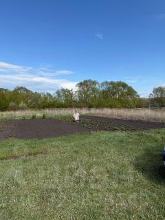 Участок квадратной формы, ровный, частично благоустроен: высажены кусты смородины, крыжовника, малины и клубники, имеется вспаханная и ухоженная огородная зона с потенциалом для дальнейшего планирования сада.