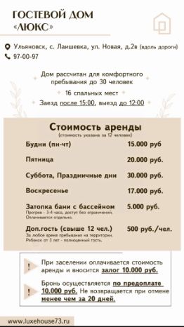 ДомАренда73 приветствует вас! Осень, самое время жарить шашлыки и купаться в теплом бассейне! Ради отдыха у нас, Вы возьмете выходной! ВСЕ АКТУАЛЬНЫЕ ЦЕНЫ УКАЗАНЫ В КАЛЕНДАРЕ ПРИ ВЫБОРЕ ДАТЫ БРОНИРОВАНИЯ Уютный трехэтажный дом в окружении тишины и природы. Дом 1 Видеообзор дома доступен в разделе фото! Все фото соответствуют действительности. 15 минутах езды от центра 2 км от Парка Победы. Дом рассчитан на 10 гостей днем и 10 с ночевой . К Вашим услугам: Бассейн общий с подогревом бесплатно (работает с 18:00 до 20:00) Огороженная детская площадка и детский батут (бесплатно)! Индивидуальная мангальная зона и уличный стол (решетки бесплатно) Бассейн 6х4м. Работает круглый год. Мгновенная бронь. Заезд после 14:00 Выезд до 12:00 Вместимость: 10 спальных мест 1 этаж- 2 дивана ( по 2 сп места) 2 этаж- кровать ( 2 сп места) 3 этаж- 2 кровати ( 4 сп места) (изолированных комнат нет) Аренда дома включает в себя: Индивидуальная мангальная зона Решетки предоставляются бесплатно Уличный стол с лавками Детская площадка и батут WI-FI на всей территории Теплый пол и кондиционер Чистое постельное белье и полотенца Караоке беспроводными микрофонами Игровая приставка PS4 с джойстиками Настольные игры Музыкальная беспроводная колонка Большой телевизор SMART TV Зона качель Кухонная техника (холодильник, микроволновая печь, чайник) Посуда (тарелки и столовые приборы) Парковка (быстрая подача такси) Залог 3000₽, возвращается до 20:00 в день выезда!