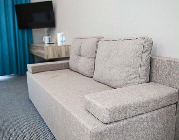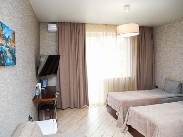 "Guest House" в Николаевке отличная остановка для путешественников и дальнобойщиков на трассе М5! На территории комплекса гостей ждут: уютные номера различных категорий — от экономичных до комфортабельных, просторная парковка для легковых автомобилей и грузовиков, круглосуточная стойка регистрации, собственное кафе с разнообразным меню и быстрым обслуживанием; бесплатный Wi-Fi, электрозарядная станция для автомобилей Гостям предлагается несколько вариантов размещения: эконом-номера с односпальными кроватями и всем необходимым для короткого отдыха; стандарт-номера с двуспальными кроватями или двумя односпальными, телевизором и собственной ванной комнатой; комфорт-номера повышенной комфортности с дополнительным пространством, диваном, холодильником и современной техникой. Все номера оснащены кондиционерами, качественной мебелью и системами звукоизоляции для полноценного отдыха даже днем. Мини-отель располагается в удобной доступности от трассы М5 по адресу: п. Николаевка, ул. Шоссейная, 4. Номер с двухспальной кроватью, в гостинной угловой диван, с холодильником. В номере телевизор, кондиционер, чайник, чашки, шкаф для одежды